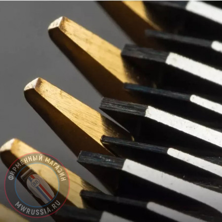 - Нижнее неподвижное лезвие с титановым напылением, повышает устойчивость лезвий к коррозии, а верхнее - с покрытием DLC (Diamond Like Carbon), которое увеличивает стойкость сплава к износу до 4 раз. Содержание в сплаве углерода укрепляет металл, за счет чего заточка держится дольше.