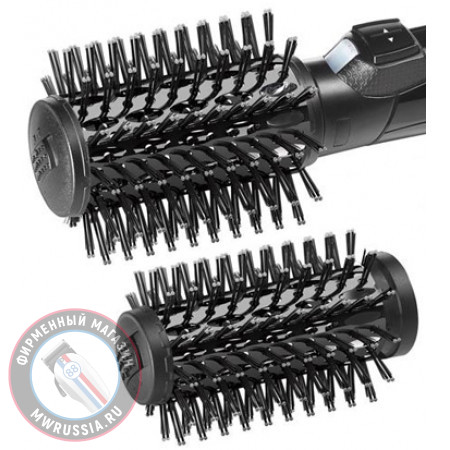 Фен-щётка оснащена двумя съемными щетками-насадками из густой, но мягкой комбинированной щетины (щетина кабана и нейлон), усиленной зубчиками с круглыми наконечниками, для предотвращения повреждения кожи головы: