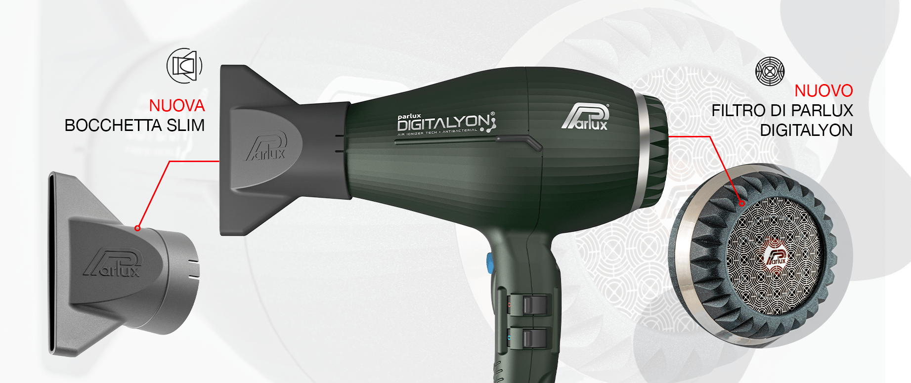 Сохраняя высочайшие характеристики, которые отличают фены Parlux уже более 40 лет, новый Parlux DIGITALYON включает в себя цифровую технологию, которая повышает его производительность с точки зрения мощности и тепла, улучшая и ускоряя работу самых требовательных профессионалов. Улучшенные функции Parlux DIGITAL YOU позволяют самому внимательному профессионалу получить идеальную и стойкую прическу за меньшее время. Укладка держится дольше с Parlux!