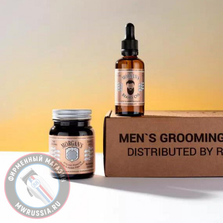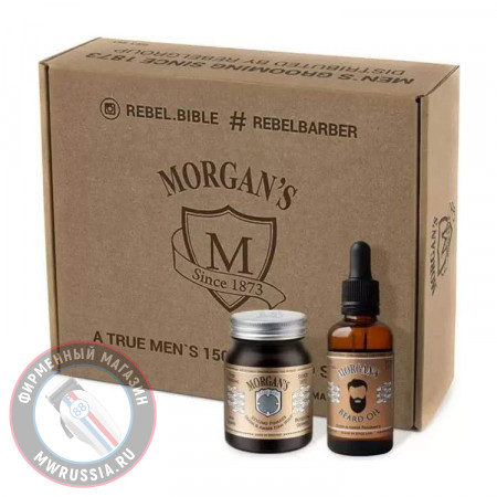 Подарочный набор Morgans MG105 - набор из двух предметов для ухода за бородой. В набор входят: масло для бороды 50 мл и помада для укладки Oudh & Amber 100 г Morgans.