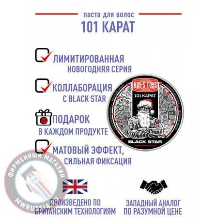 Паста для укладки волос высокой фиксации с низким уровнем блеска Boy's Toys 101 карат Christmas Edition 100 мл BT157- паста для укладки волос с сильной степенью фиксации. Это всеми любимый 101 карат в обновлённом новогоднем дизайне и с ароматом «Кленового сиропа», который располагает к зимнему уютному настроению!