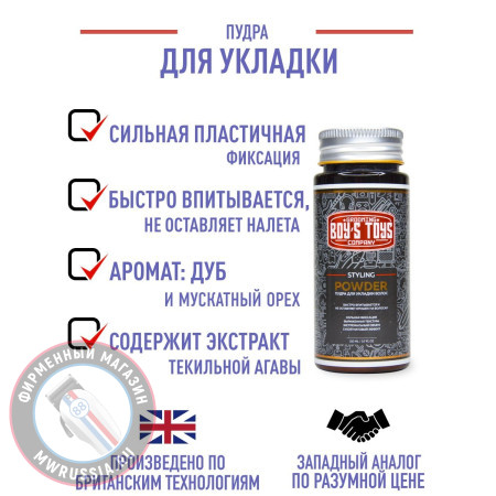 - Пудра для укладки волос от Boy’s Toys будет держать объем прически в течение всего дня.