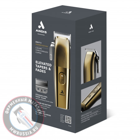 Машинка Andis Envy II Premium Edition - универсальный инструмент с керамическим ножом Phaze и широким диапазоном высоты среза от 0,25 мм до 3,5 мм. Максимальный контроль и комфорт в работе с дополнительным рычагом установки высоты среза для работы правой или левой рукой. Корпус золотистого цвета премиум класса с рифленой поверхностью позволит избежать скольжения и обеспечит лучшую сцепку с рабочей поверхностью. Подставка для зарядки, доступная в лимитированном выпуске ANDIS ENVY II, позволит быстро зарядить и удобно хранить вашу машинку.