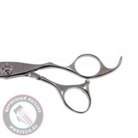 Ручка: Модель имеет эргономичную ручку. Кольца (верхнее: 18-21 мм; нижнее: 17-22 мм) расположены в двух плоскостях. Нижнее имеет разворот к большому пальцу, что создает дополнительный комфорт и свободу движений, а также удобство во время работы. Ножницы можно ставить под любым углом и производить срезы. Данная эргономика способствует более стабильно и комфортно удерживать ножницы при работе разными техниками, кисть руки в любом положении испытывает комфортное состояние на протяжении всего рабочего дня. Ручка и полотно максимально сбалансированы.