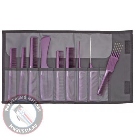 Набор профессиональных расчесок Jaguar A-Line Ionic 9 шт ионные, лиловые 05599-10 - набор пластиковых расчесок лилового цвета с ионами. Классический модельный ряд Jaguar Ionic Line, состоит из 9 расчесок (расческа-гребень, расческа для окрашивания, хвост пластмассовый, хвост металлический, комбинированная мужская, комбинированная конусная, комбинированная женская, расческа-вилка, расческа-зверевка). Расчески в эргономичном чехле легко хранить и удобно использовать во время работы.