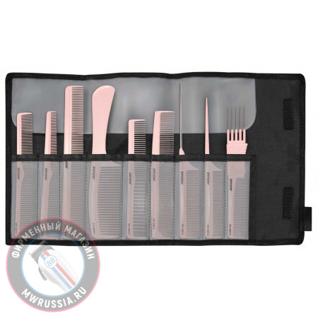 Набор профессиональных расчесок Jaguar A-Line Ionic A599-10 - набор пластиковых расчесок нежно розового цвета с ионами. Классический модельный ряд Jaguar Ionic Line, состоит из 9 расчесок (расческа-гребень, расческа для окрашивания, хвост пластмассовый, хвост металлический, комбинированная мужская, комбинированная конусная, комбинированная женская, расческа-вилка, расческа-зверевка). Расчески в эргономичном чехле легко хранить и удобно использовать во время работы.