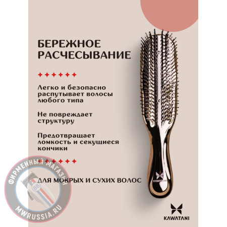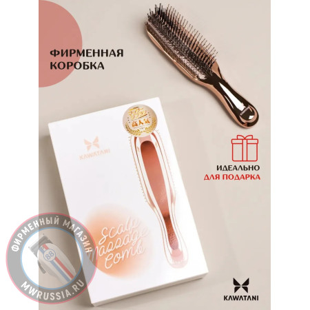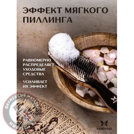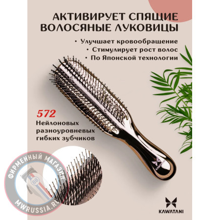 Инновационная массажная щётка Kawatani разработана специально для эффективного очищения и деликатного массажа кожи головы. Запатентованная форма расположения щетинок разной длины и жёсткости позволяет бережно и тщательно очищать поры на голове, увеличить приток крови к фолликулам, предотвращать выпадение волос, стимулировать их рост, активизировать спящие волосяные луковицы. Благодаря мягким нейлоновым зубчикам чешуйки кутикулы приглаживаются, волосы легко распутываются, становятся мягкими и шелковистыми, приобретают блеск и глянец. Улучшение кровоснабжение волосистой части кожи головы усиливает приток кислорода и питательных веществ, волосы становятся гуще и сильнее, улучшается их структура.