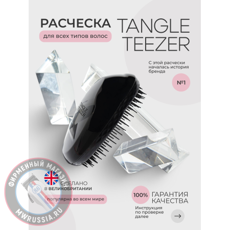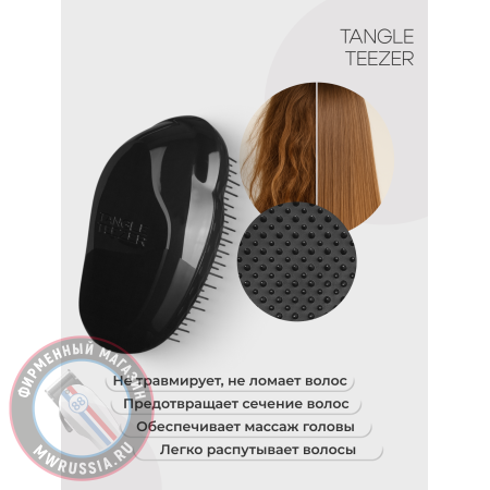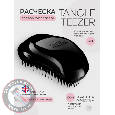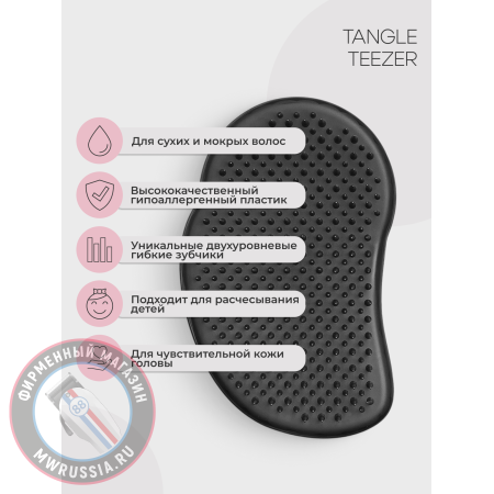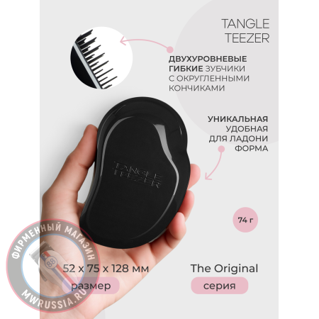 Новая упаковка: расческа The Original Panther Black в обновленной картонной упаковке. Внутри – все та же расческа! Tangle Teezer The Original Panther Black – расческа для ежедневного ухода за прямыми и волнистыми волосами, представлена в черном цвете. Гибкие зубчики бережно распутывают волосы, не царапая кожу и оказывая массажный эффект. Благодаря эргономичной форме и уникальным двухуровневым зубчикам расческа легко скользит по прядям, не травмирует их и предупреждает ломкость. Результат применения – гладкие и блестящие волосы. Модель The Original подходит для влажных и сухих волос. Не используйте с феном.