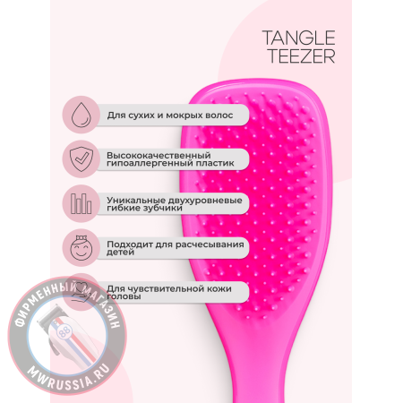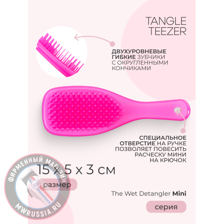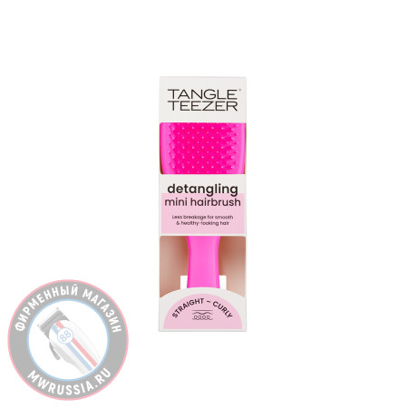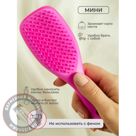 Новое имя: расческа The Wet Detangler Mini теперь называется The Ultimate Detangler Mini. В обновленной картонной упаковке – все та же расческа! Расческа Tangle Teezer The Ultimate Detangler Mini Runway Pink в ярко-розовом оттенке – мини-формат знаменитой модели The Ultimate Detangler. Запатентованные двухуровневые зубчики бережно распутывают влажные пряди, а также равномерно распределяют маски и бальзамы по волосам. Благодаря уменьшенному размеру расческу удобно брать с собой. Специальное отверстие на ручке позволяет прикрепить The Ultimate Detangler Mini к косметичке и иметь под рукой в любой ситуации. Результат применения – гладкие и блестящие волосы. Подходит для прямых и волнистых волос. Не используйте с феном.