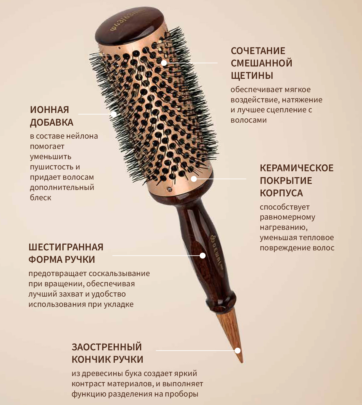 • Ионная добавка в составе нейлона помогает уменьшить пушистость и придает волосам дополнительный блеск.